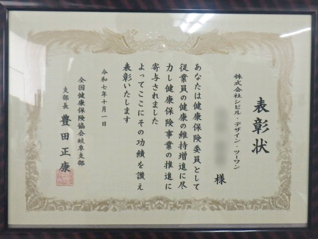 2025.11.27健康保険委員功労者として表彰されました 令和7年11月19日、全国健康保険協会等が主催の「岐阜県年金委員・健康保険委員功労者表彰」が行われ、 当社は健康保険委員功労者として「全国健康保険協会 岐阜支部支部長表彰」を受けました。 この表彰は、健康保険事業の推進および発展に向けた取り組みが評価されたものであります。 今後も従業員の健康維持と向上に貢献できるよう、より一層励んでまいります。 古い記事へ 記事一覧へ